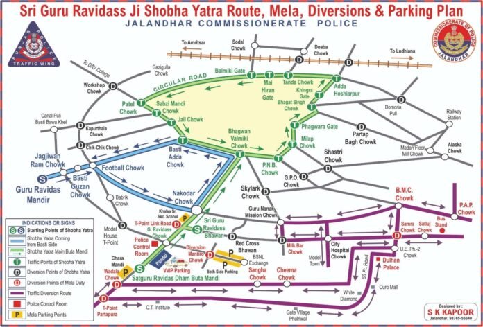 शोभायात्रा गुरुद्वारा साहिब बूटा मंडी से शुरू होकर श्री गुरु रविदास चौक, डॉ. भीमराव अंबेडकर चौक (नकोदर चौक), भगवान वाल्मीकि चौक (ज्योति चौक) और पटेल चौक से गुजरते हुए पुनः गुरुद्वारा साहिब बूटा मंडी पर समाप्त होगी। ट्रैफिक डायवर्जन प्लान 31 जनवरी को सुबह 9 बजे से रात 8 बजे तक लागू रहेगा, जबकि कुछ मार्गों पर 31 जनवरी से 1 फरवरी तक यातायात पूरी तरह बंद रहेगा।
